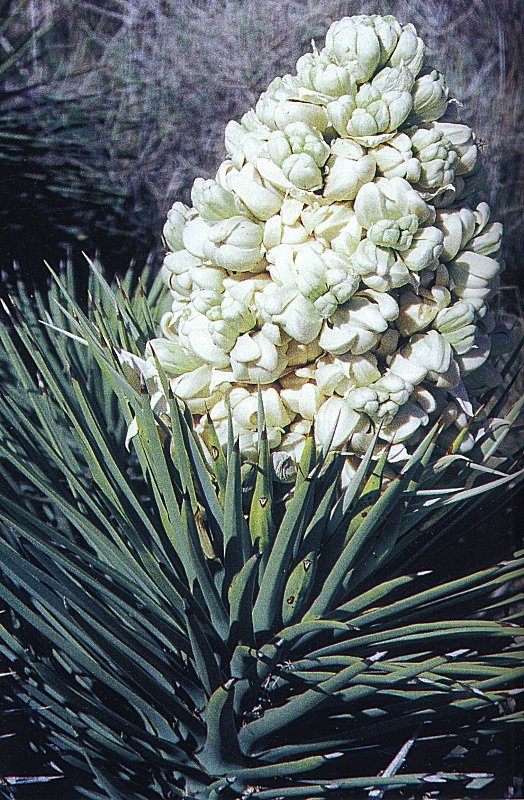 ![]() Yucca brevifolia ssp.herbertii, CAL. Close -up of the terminal inflorescence, showing the dense arrangement of flowers, which scarcely open, and the unique leaf form of the Joshua tree. |